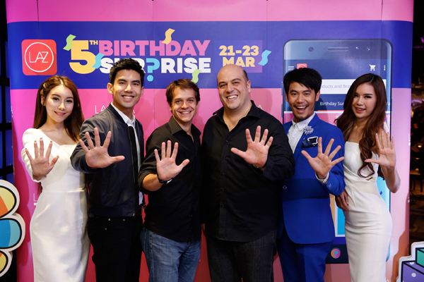 คุณอเล็กแซนดรอ บิสชินี ประธานเจ้าหน้าที่ฝ่ายบริหาร และ คุณแบบติสต์ ลีเกิ้ล ประธานเจ้าหน้าที่ฝ่ายการตลาด ลาซาด้า ประเทศไทย พร้อมด้วยคุณเต๋อ ฉันทวิชช์ และ ดีเจอ๋อง เขมรัชต์ ร่วมฉลองวันเกิดครบรอบห้าปีของลาซาด้า ประเทศไทย