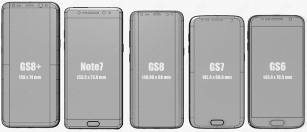 โดยจากภาพจะเห็นได้ว่า Galaxy S8 ที่อยู่ด้านซ้ายนั้น ถึงแม้ว่าจะมีขนาดหน้าจอ 5.7 นิ้วเทียบเท่ากับ Galaxy Note 7 ที่วางอยู่ตรงกลาง แต่ทว่ากลับมีพื้นที่ในการแสดงผลที่มากกว่าอย่างชัดเจน เนื่องจาก Galaxy S8 ได้ขยายหน้าจอพาดยาวขึ้นไปด้านบน รวมถึงตัดปุ่มโฮม และปุ่มควบคุมที่ด้านล่างออก พร้อมทั้งหันไปใช้งาน On-screen buttons แทน ทำให้สามารถลดพื้นที่ขอบล่างได้อีก ส่วนทางด้าน Galaxy S8+ ที่อยู่ทางด้านขวาถึงแม้ว่าจะมีตัวเครื่องสูงกว่า Galaxy Note 7 เพียงเล็กน้อย แต่กลับมีจอแสดงผลที่กว้างเต็มตากว่าอย่างชัดเจน เนื่องจากการตัดปุ่มต่างๆ ออกไปเช่นเดียวกับรุ่นน้องนั่นเอง ซึ่งตามรายงานคาดการณ์ว่า Galaxy S8+ จะถูกส่งเข้าแข่งขันในตลาดแฟ็บเล็ตด้วยจอไซส์ใหญ่ถึง 6.2 นิ้ว