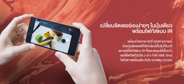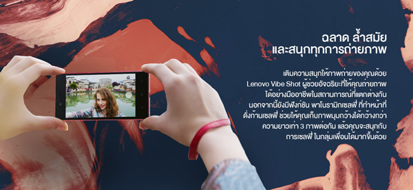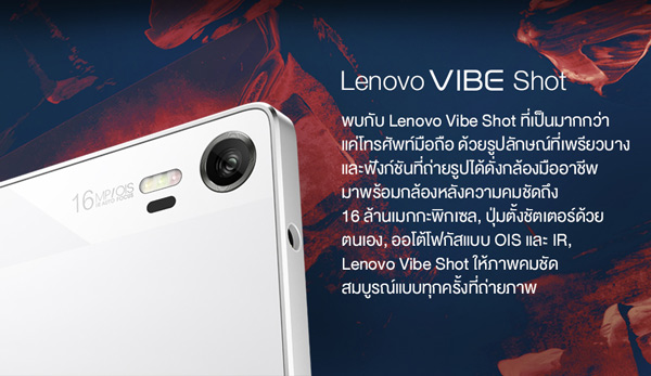 พบกับ Lenovo VIBE Shot ที่เป็นมากกว่าเเค่โทรศัพท์มือถือ ด้วยรูปลักษณ์ที่เพียวบาง เเละฟังก์ชั่นที่ถ่ายรูปได้ดังกล้องมืออาชีพ เเละยังมาพร้อมกล้องหลังที่มีความคมชัดถึง 16 ล้านพิเซล โดยมีปุ่มชัตเตอร์ด้วยตนเอง ออโต้โฟกัสเเบบ OIS เเละ IR , ดังนั้น Lenovo VIBE Shot รุ่นนี้จึงให้ภาพความคมชัดที่สมบูรณ์เเบบในทุกครั้งที่คุณถ่ายรูป