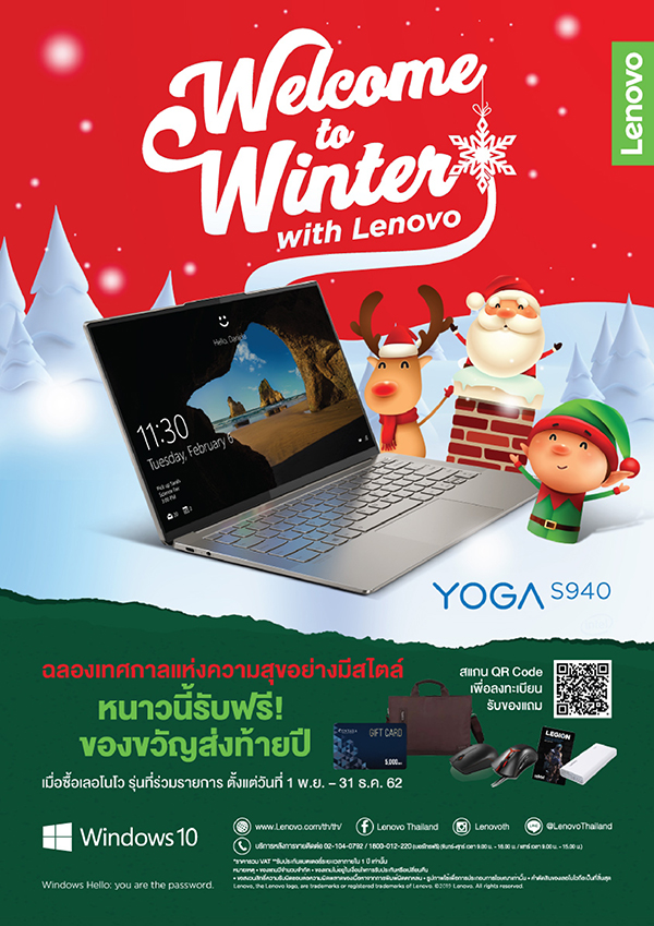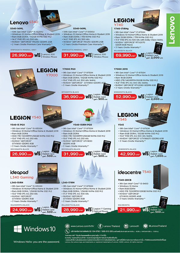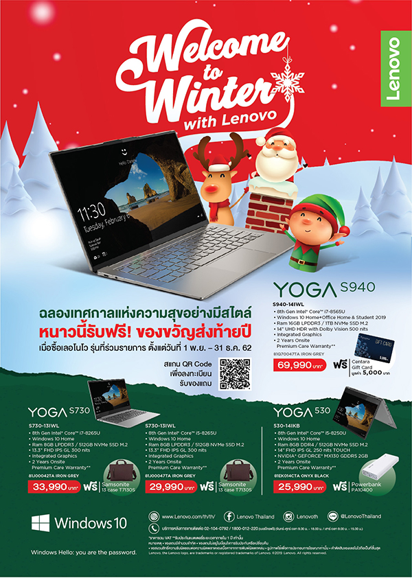 กรุงเทพฯ, ประเทศไทย – 26 พฤศจิกายน 2562 – เลอโนโว บริษัทผู้นำด้านคอมพิวเตอร์และสมาร์ทดีไวซ์ระดับโลก ร่วมฉลองเทศกาลแห่งความสุข ขนแล็ปท็อปตระกูล Yoga, Legion, IdeaPad และ IdeaCentre มาร่วมโปรโมชั่นพิเศษ ส่งท้ายปีเก่าต้อนรับปีใหม่ พร้อมมอบของแถมฟรี อาทิ บัตรกำนัล Centara, กระเป๋าแล็ปท็อป Samsonite และแรบบิทการ์ด Legion เมื่อลูกค้าซื้อผลิตภัณฑ์ของเลอโนโวที่ร่วมรายการ ตั้งแต่วันนี้ ถึงวันที่ 31 ธันวาคม 2562