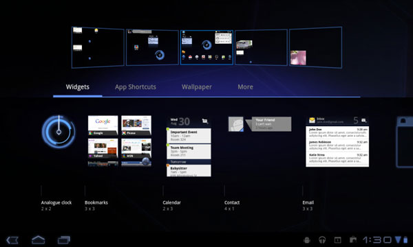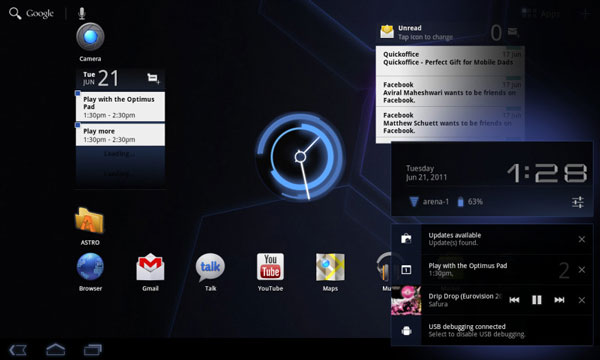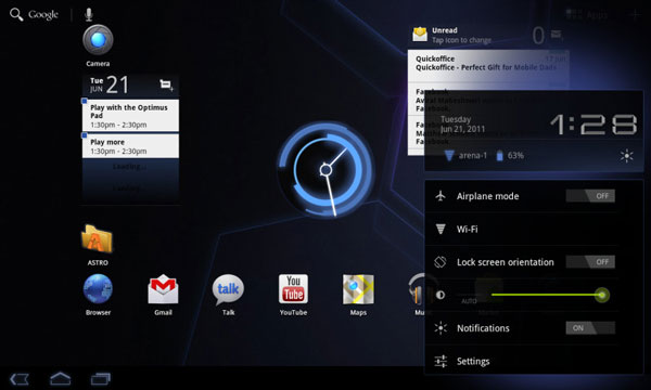 หน้าจอของ LG Optimus Pad นั้น มีขนาด 8.9 นิ้วครับ ความละเอียด 1280x768 พิกเซล ซึ่งถือว่า มีขนาดที่ไม่เล็ก และไม่ใหญ่จนเกินไปครับ อย่างไรก็ดี หน้าจอแสดงผลแบบ TFT นั้น อาจจะถูกจำกัดมุมในการมองเล็กน้อยครับ พูดง่ายๆ ก็คือ ถ้าเรามองหน้าจอของ LG Optimus Pad ในมุมมองที่ต่างกัน จะให้ความสว่างและสีสันที่แตกต่างกันครับ
