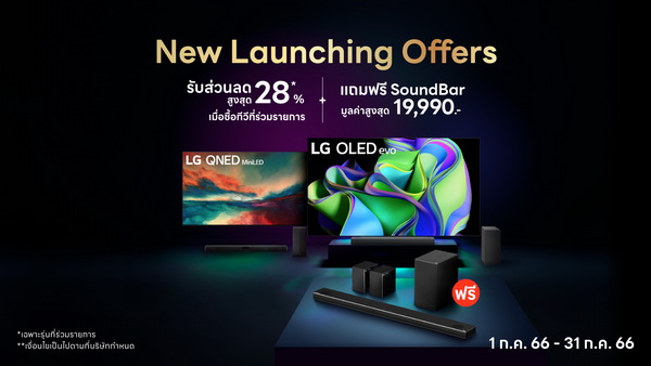 พร้อมกันนี้ยังส่งข้อเสนอสุดพิเศษ “ซื้อทีวีรับฟรีซาวด์บาร์” รับสิทธิพิเศษ 2 ต่อ ทั้งส่วนลด และของแถมซาวด์บาร์มูลค่าสูงสุด 19,990 บาท ข้อเสนอพิเศษนี้ สำหรับทีวีรุ่นใหม่ล่าสุดของแอลจีในปี 2023 ที่เข้าร่วมรายการ โดยมาพร้อมเทคโนโลยีระดับพรีเมียม อาทิ OLED TV ที่สุดของทีวีโอเลตเปล่งแสงเองซึ่งให้ความสว่างและคมชัดยิ่งกว่า และ QNED TV ที่มอบสีสันเจิดจรัสด้วยเทคโนโลยี Quantum Dot และ NanoCell โดยข้อเสนอสุดพิเศษสำหรับทีวีรุ่นที่ร่วมรายการ มีดังนี้