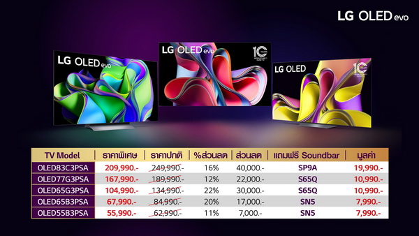 - ทีวี OLED evo 4K ซีรีส์ C3 ขนาด 55 นิ้ว ราคาโปรโมชันเมื่อจับคู่กับซาวด์บาร์ SC9 อยู่ที่ 79,990 บาท หรือประหยัดได้ถึง 23,990 บาท
