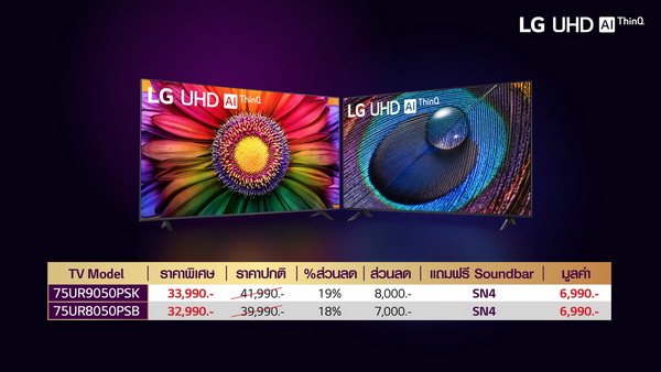 - ทีวี QNED ซีรีส์ QNED80 4K ขนาด 75 นิ้ว ราคาพิเศษ 49,990 บาท จากราคาเต็ม 61,990 บาท พร้อมรับฟรีซาวด์บาร์รุ่น SN4 มูลค่า 6,990 บาท