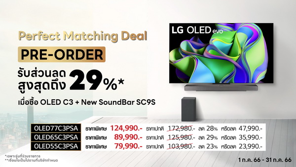 - ทีวี OLED evo 4K ซีรีส์ C3 ขนาด 77 นิ้ว ราคาโปรโมชันเมื่อจับคู่กับซาวด์บาร์ SC9 อยู่ที่ 124,990 บาท หรือประหยัดได้ถึง 47,990 บาท