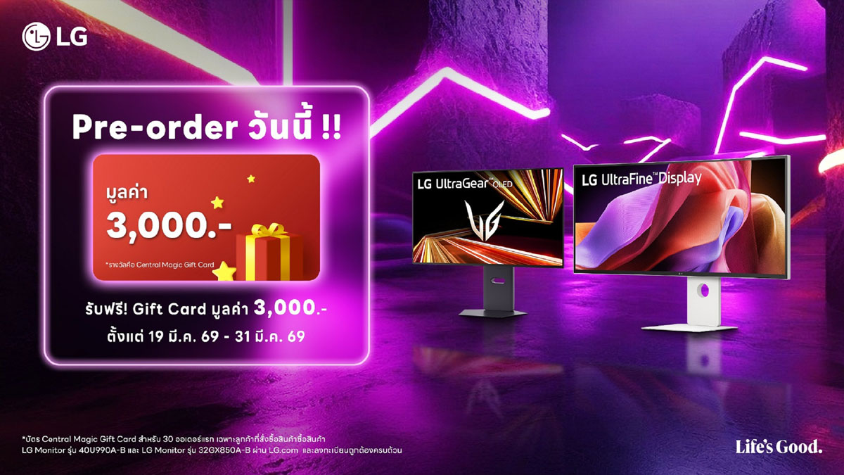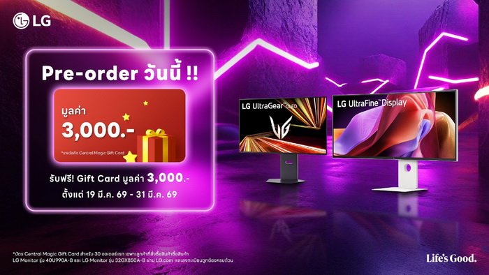 อย่าพลาด! โอกาสสุดพิเศษในการเป็นเจ้าของจอมอนิเตอร์รุ่นใหม่จากแอลจี พร้อมโปรโมชั่นสุดคุ้มใน 3 รุ่นที่ร่วมรายการ ได้แก่ LG UltraFine™ Display 5K2K รุ่น 40U990A-W, LG UltraGear™ OLED GX8 รุ่น 32GX850A-B และ LG UltraGear™ G8 รุ่น 27G810A-B เปิดให้จองพรีออเดอร์ผ่าน LG.com ได้แล้วตั้งแต่วันที่ 19 - 31 มีนาคม 2569 ยิ่งไปกว่านั้น สำหรับ 30 ออเดอร์แรกที่สั่งจองรุ่น 40U990A-W และ 32GX850A-B จะได้รับ Magic Gift Card มูลค่า 3,000 บาท ฟรีทีนที