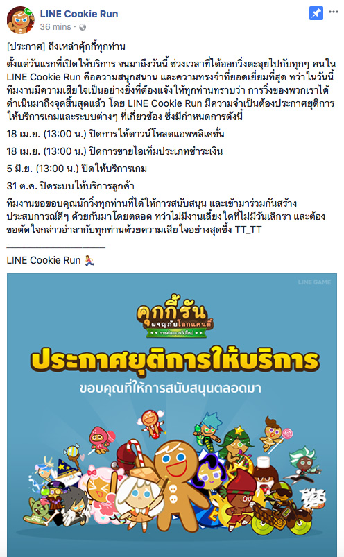 โดยข้อมูลการประกาศปิดให้บริการเกม LINE Cookie Run บนหน้าแฟนเพจ มีรายละเอียดดังนี้