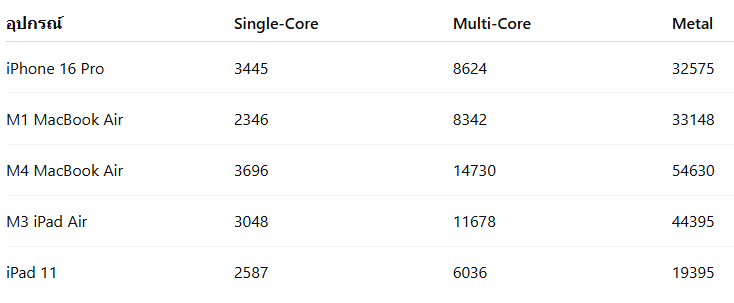 และเมื่อนำไปเปรียบเทียบกับอุปกรณ์อื่น ๆ ที่มีระดับประสิทธิภาพใกล้เคียงกัน จากตัวเลขจะเห็นได้ว่า MacBook Neo มีคะแนน Metal ต่ำกว่า iPhone 16 Pro เล็กน้อย ซึ่งเป็นผลมาจากการที่ตัวเครื่องมี GPU Core น้อยกว่า 1 Core
