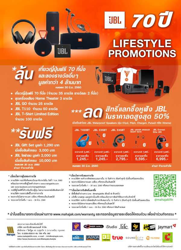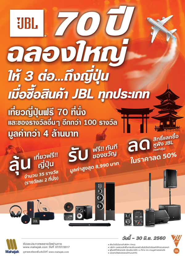 JBL ครบรอบ 70 ปี ทั้งที จัดหนัก จัดเต็มกันไปเลย... เมือซื้อสินค้า JBL ทุกประเภท ลุ้นรางวัลต่อแรก เที่ยวญี่ปุ่นฟรี 70 ที่นั่ง และของรางวัลอื่นๆ อีกกว่า 100 รางวัล มูลค่ากว่า 4 ล้านบาท