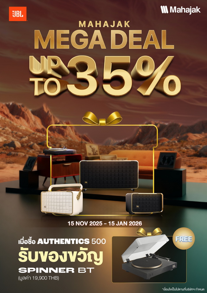 บริษัท มหาจักรดีเวลอปเมนท์ จำกัด ร่วมส่งท้ายปีด้วยแคมเปญ MAHAJAK MEGA DEAL 2025 มอบของขวัญสุดพิเศษสำหรับผู้ที่รักเสียงเพลงและงานออกแบบใน Design Retro ด้วยส่วนลดสูงสุด 35% และรับของขวัญพรีเมียม Spinner BT มูลค่า 19,900 บาท เมื่อซื้อ JBL Authentics 500 ตั้งแต่วันที่ 15 พฤศจิกายน 2568 – 15 มกราคม 2569 เท่านั้น