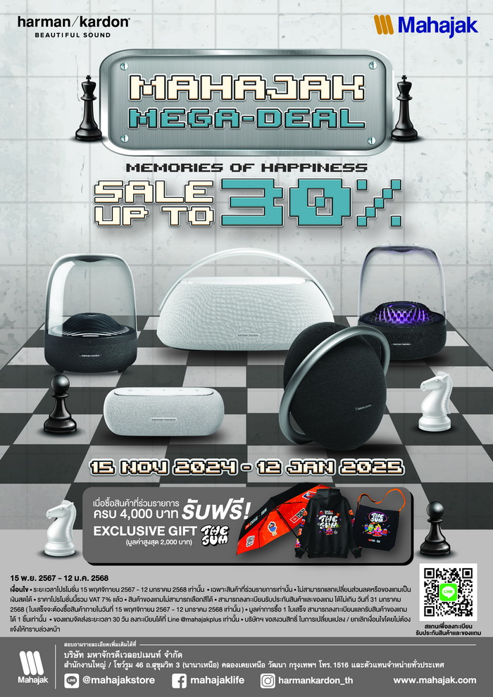 บริษัท มหาจักรดีเวลอปเมนท์ จำกัด มอบ ดีลสุดพิเศษเอาใจสาวก HARMAN KARDON กับ MAHAJAK MEGA-DEAL MEMORIES OF HAPPINESS ที่ขนสินค้าลำโพง HARMAN KARDON มาให้ทุกคนได้เลือกช้อป และเป็นเจ้าของกันในราคาสุดพิเศษลดสูงสุด 30% พร้อมรับของแถมสุดพรีเมียมอาทิเช่น กระเป๋าผ้า, ร่ม และเสื้อฮูดสุดเท่ ที่ออกแบบโดย “ The Jum “ ศิลปินชาวไทยกับศิลปะแนว Pop Art เจ้าของคาแรคเตอร์ “ Fire Friend “ ( เฉพาะสินค้าที่ร่วมรายการ ) กิจกรรมเริ่มตั้งแต่วันที่ 15 พฤศจิกายน - 12 มกราคม 2568 นี้ เท่านั้น โดยรายละเอียดสินค้าที่เข้าร่วมรายการดังนี้