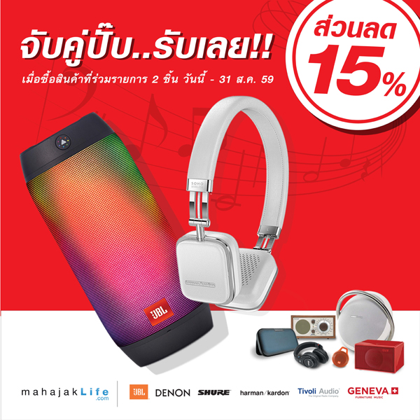 จับคู่สินค้าปุ๊บ รับส่วนลดปั๊บ 15% พลาดไม่ได้เลยสำหรับผู้ที่รักเสียงดนตรี เพราะทางมหาจักรได้จัดโปรโมชั่นสุดคุ้ม.. เพียงแค่ทุกท่านซื้อสินค้า Multimedia ลำโพง-หูฟัง รุ่นที่ร่วมรายการ ตั้งแต่วันที่ 16 - 31 สิงหาคม 2559 นี้