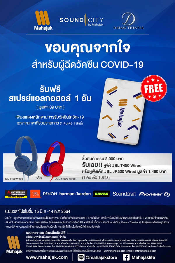 บริษัท มหาจักรดีเวลอปเมนท์ จำกัด ร่วมสนับสนุนการฉีดวัคซีน มอบสิทธิพิเศษแทนคำขอบคุณสำหรับผู้ที่ฉีด Vaccine เพียงแสดงหลักฐานการฉีดวัคซีนโควิด-19 ที่หน้าร้าน Sound City, ร้าน Dream Theater และ Showroom Mahajak พร้อมรับสิทธิ์พิเศษดังนี้
