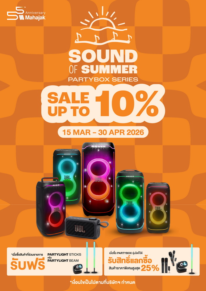 บริษัท มหาจักรดีเวลอปเมนท์ จำกัด เปิดตัวแคมเปญรับหน้าร้อนอย่างยิ่งใหญ่กับ MAHAJAK SOUND OF SUMMER ขนทัพลำโพงยอดฮิต JBL PARTYBOX SERIES มาจัดโปรโมชั่นราคาพิเศษ พร้อมมอบสิทธิ์แลกซื้อสุดเอ็กซ์คลูซีฟและของแถมสุดพรีเมียม ให้คุณได้เป็นเจ้าของชุดปาร์ตี้ในฝันในราคาสุดคุ้ม โดยมีรายละเอียดโปรโมชัน ดังนี้:
