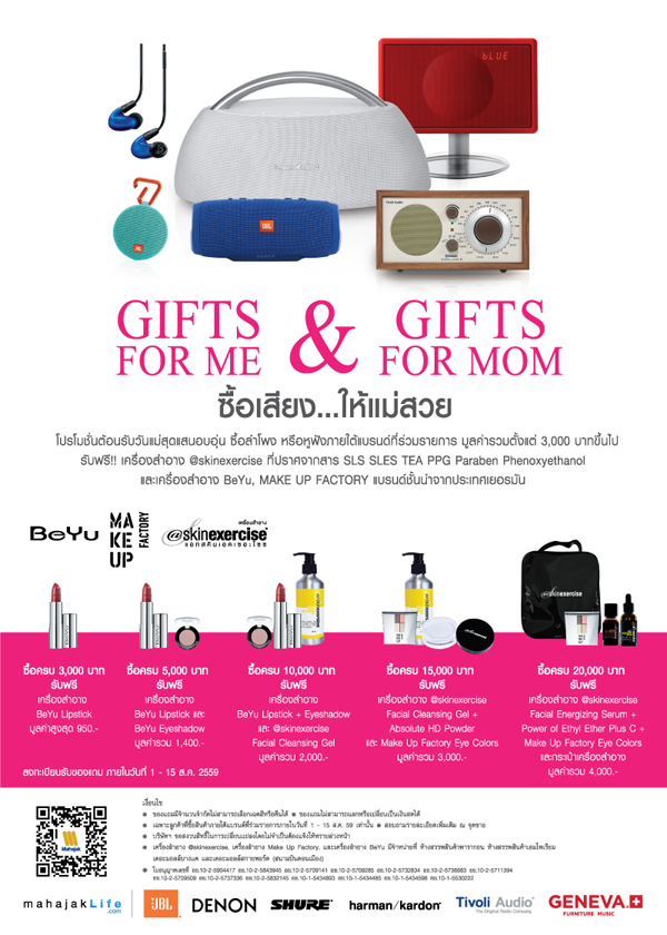 ต้อนรับเทศกาลวันแม่ ที่จะมาถึงในเดือนสิงหาคมนี้ ด้วยโปรโมชั่นสุดพิเศษจากทางมหาจักร เมื่อซื้อลำโพง หรือหูฟังภายใต้แบรนด์ JBL , Denon , Shure , Harman/Kardon , Tivoli Audio , Geneva มูลค่ารวมตั้งแต่ 3,000 บาท ขึ้นไป รับฟรี!! เครื่องสำอางจาก @skinexercise เครื่องสำอางที่ปราศจากสาร SLS SLES TEA PPG Paraben Phenoxyethanol และเครื่องสำอาง BeYu , MAKE UP FACTORY แบรนด์ชั้นนำจากประเทศเยอรมัน พร้อมฟังเพลงกับแม่ไปแบบสวยๆ รีบจับจองเป็นเจ้าของได้เลย ตั้งแต่ วันนี้ – 15 สิงหาคมนี้