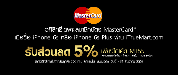 ยังคงเป็นผู้นำในตลาดอีคอมเมิร์ซในเมืองไทยอย่างต่อเนื่องกับ iTrueMart อีคอมเมิร์ซสัญชาติไทยแท้ที่มาพร้อมโปรโมชั่นและสิทธิพิเศษมากมายตลอดทุกเดือน รวมถึงสินค้าสมาร์ทโฟนราคาพิเศษหลายรุ่น โดยล่าสุดทาง iTrueMart ได้ร่วมกับ MasterCard มอบสิทธิ์พิเศษเหนือใครให้ผู้ที่ช้อปปิ้ง iPhone 6S และ iPhone 6S Plus ทุกรุ่นความจุที่ iTrueMart ด้วยบัตร MasterCard กับส่วนลดทันที 5% ไม่ต้องรอ Cash Back ถึงวันที่ 31 ธันวาคมนี้เท่านั้น ช้าอด คลิกดูรายละเอียดโปรโมชั่นได้ที่นี่เลย >> https://bit.ly/1Oi7BQ3