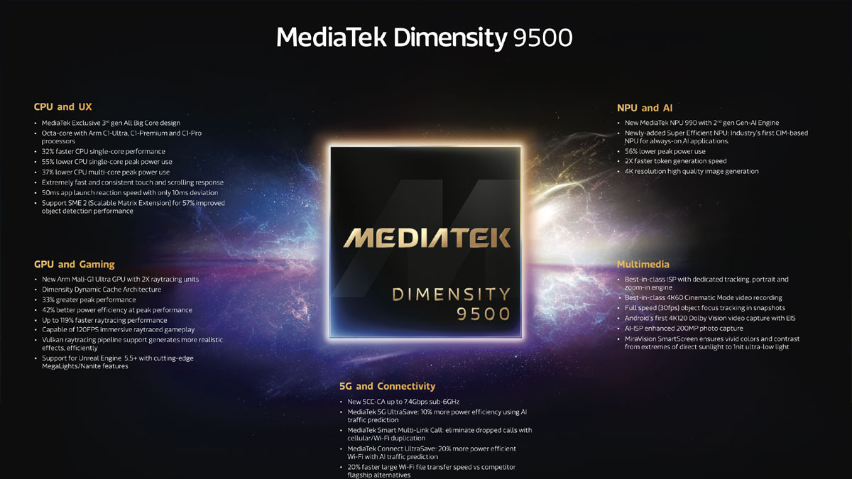 MediaTek ผู้นำด้านนวัตกรรม SoC สำหรับสมาร์ทโฟนระดับโลกได้ประกาศเปิดตัวแพลตฟอร์มมือถือที่ล้ำสมัยที่สุด MediaTek Dimensity 9500 ที่สร้างมาตรฐานใหม่ให้แก่ AI แบบ On-device พร้อมทั้งประสบการณ์เกมมิ่งคอนโซล และการประหยัดพลังงาน ชิปเซ็ต MediaTek Dimensity 9500 ได้ออกแบบมาเพื่อเสริมพลังขั้นสุดยอดให้แก่สมาร์ทโฟน 5G รุ่นเรือธงต่อไป