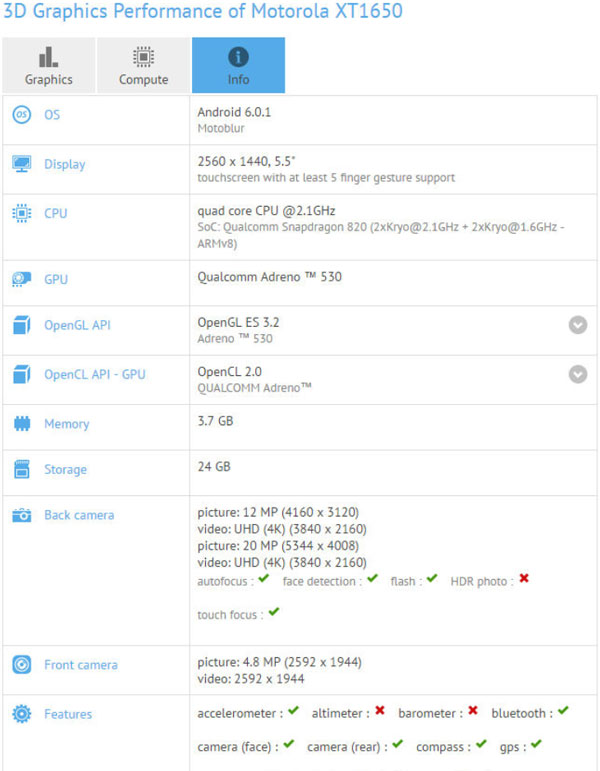 โดยผลการทดสอบจาก GFXBench เผยว่า สมาร์ทโฟนรุ่นนี้มาพร้อมกับ หน้าจอแสดงผลขนาด 5.5 นิ้ว ความละเอียด 1440 x 2560 พิกเซล, ชิปเซ็ต Qualcomm Snapdragon 820 แบบ Quad-Core Processor ความเร็ว 2.1 GHz, หน่วยประมวลผลภาพกราฟิก Adreno 530 GPU, หน่วยความจำ RAM ขนาด 4 GB และหน่วยความจำภายในตัวเครื่องขนาด 32 GB นอกจากนี้ ยังคาดว่า จะมาพร้อมกับกล้องคู่ด้านหลังแบบ Dual-Camera ความละเอียด 20 ล้านพิกเซล และ 12 ล้านพิกเซล รองรับการถ่ายคลิปวีดีโอความละเอียด 4K ส่วนกล้องด้านหน้า ความละเอียดอยู่ที่ 5 ล้านพิกเซล