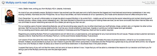 [9-สิงหาคม-2555] นับว่าเป็นข่าวร้ายของสังคมตากล้องเลยก็ว่าได้ เมื่อเว็บไซต์ Multiply เว็บไซต์สำหรับผู้รักการถ่ายภาพ ที่เปิดให้บริการมานานกว่า 8 ปี ได้ตัดสินใจปิดให้บริการเป็นการถาวรแล้ว ในวันที่ 1 ธันวาคมนี้ โดยจะยุติการให้บริการทั้งการฝากไฟล์ภาพ บล็อก และเนื้อหาทั้งหมด เหลือเพียงการให้บริการด้าน e-commerce เท่านั้น