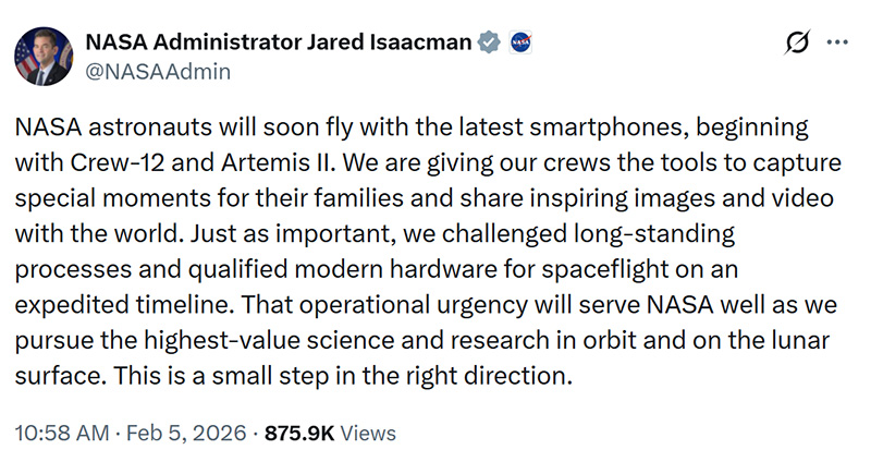 Jared Isaacman ผู้บริหารสูงสุดของ NASA ประกาศเมื่อวันพุธที่ผ่านมาว่า NASA เตรียมอนุญาตให้นักบินอวกาศสามารถพกพาและใช้งาน “สมาร์ตโฟนรุ่นล่าสุด” ระหว่างภารกิจอวกาศได้อย่างเป็นทางการ โดยจะเริ่มตั้งแต่ภารกิจ SpaceX Crew-12 และ Artemis II ภายในช่วงไม่กี่เดือนข้างหน้านี้