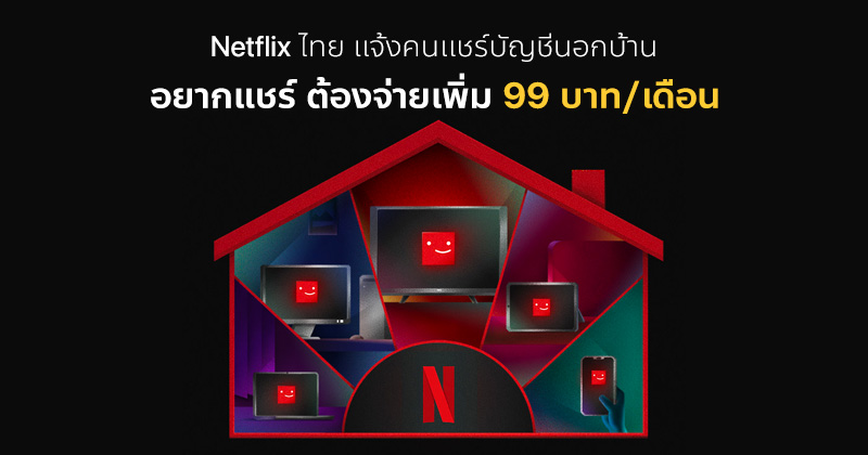 สำหรับระบบการแชร์บัญชีระหว่างครัวเรือนของ Netflix นั้น มีเงื่อนไขว่า ผู้ใช้งานบัญชีเดียวกัน ต้องพักอาศัยในครัวเรือนเดียวกัน และสามารถรับชม Netflix ที่ใดก็ได้ ส่วนบุคคลที่ไม่ได้อาศัยอยู่ด้วยกัน สามารถแชร์ Netflix ได้ แต่จะต้องจ่ายเพิ่มอีก 99 บาท/เดือน