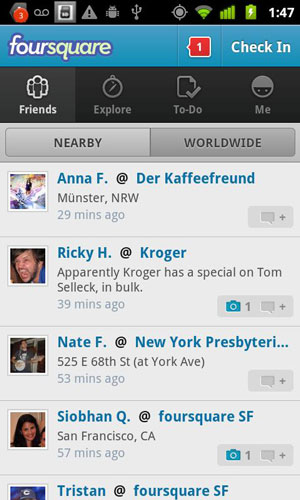 [16-สิงหาคม-2554] สำหรับชาวแอนดรอยด์ที่รักการ Check in ผ่านแอพพลิเคชั่น Foursquare ตอนนี้ Foursquare for Android ได้มีการปรับปรุงใหม่แล้วนะครับ โดยปรับการใช้งานให้ง่ายขึ้นและสะดวกขึ้นกว่าเดิม ซึ่งสิ่งที่ถูกปรับปรุงและเพิ่มเข้ามาใหม่ มีดังนี้ครับ