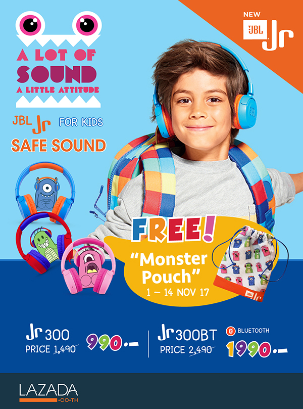 สำหรับ JBL JR300 จากราคา 1,490 บาท เหลือเพียง 990 บาท และ JBL JR300BT จากราคา 2,490 บาท เหลือเพียง 1,990 บาท พิเศษสุด!! เมื่อซื้อสินค้าผ่านทาง LAZADA แถมฟรี “Monster Pouch” ตั้งแต่วันนี้-14 พ.ย. 60 สามารถซื้อสินค้าได้แล้วที่ www.lazada.com หรือ คลิกที่ลิ้งค์นี้เลย https://www.lazada.co.th/catalog/?scs=0&q=jbl%20jr&sc=MRcC
