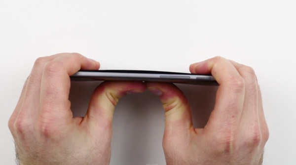 โดย iPhone 6 ถูกประเดิมดัดเป็นเครื่องแรก ซึ่งถ้าเทียบกับ iPhone 6 Plus แล้ว จะเห็นได้ว่า iPhone 6 ดูแข็งแรงกว่ามาก แม้จะสามารถดัดได้ แต่ก็ไม่โค้งงอเท่ากับ iPhone 6 Plus ในขณะที่ 3 เครื่องทดสอบที่เหลือ ไม่สามารถดัดได้ครับ แต่ HTC One M8 จอภาพเผยอเล็กน้อย ในขณะที่ new Moto X แข็งแรงมาก ไม่สะทกสะท้านเลยแม้แต่น้อย ส่วน Nokia Lumia 1020 มีเสียงกรอบแกรบเล็กน้อย แต่ไม่เป็นอะไรครับ