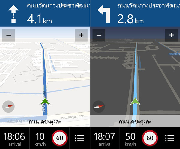 โดย Nokia Drive+ นั้น สามารถแสดงผลได้ในรูปแบบของ 2 มิติ หรือ 3 มิติ ตามแต่จะตั้งค่า ซึ่งจริงๆ การแสดงผลจะไม่แตกต่างกันมากครับ เพียงแต่มุมมองของภาพจะต่างกันเล็กน้อย