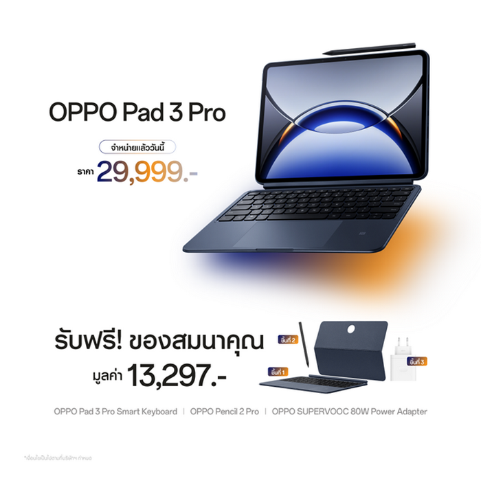 ตั้งแต่วันที่ 22 พฤศจิกายน 2567 เป็นต้นไป เมื่อลูกค้าทําการซื้อ OPPO Pad 3 Pro ลูกค้าจะได้รับของสมนาคุณ มูลค่า 13,297 บาท โดยมีรายละเอียดดังนี้
