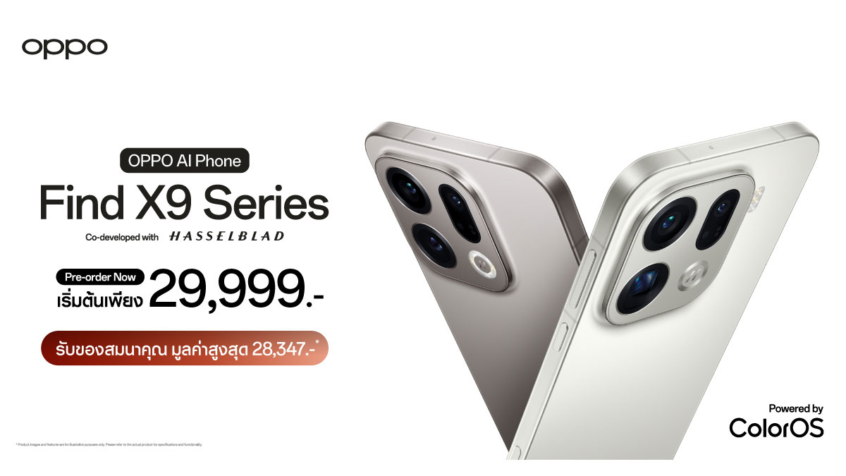ออปโป้ ประเทศไทย เปิดตัวสมาร์ตโฟนแฟลกชิปรุ่นใหม่ล่าสุด “OPPO Find X9 Series” สมาร์ตโฟน “ซูมดีทุกคอนเสิร์ต” ที่ครบเครื่องทั้งภาพนิ่งและวิดีโอระดับโปรในเครื่องเดียว ด้วยเทคโนโลยีกล้อง Hasselblad Telephoto ความละเอียดสูงสุด 200MP พร้อมพลังซูมไกล 120x Super Zoom และโหมด Stage Mode เก็บครบทุกอารมณ์และจังหวะของศิลปินด้วยวิดีโอคมชัดระดับ 4K 120fps สานต่อความร่วมมือกับ Hasselblad ยกระดับพอร์ตเทรตให้สีผิวธรรมชาติ มีมิติ แสง และโทนสีสมจริงในทุกช็อตผ่านโหมด Hasselblad Portrait ทำงานลื่นไหลยิ่งกว่าเคยด้วยระบบปฏิบัติการ ColorOS 16 ใหม่ล่าสุด บนดีไซน์ใหม่สะท้อนความพรีเมียมทุกองศา ขอบหน้าจอบางเฉียบ จับถนัดมือ เปิดตัวพร้อมกัน 2 รุ่น ได้แก่ OPPO Find X9 Pro ในราคา 42,999 บาท และ OPPO Find X9 ในราคาเริ่มต้น 29,999 บาท พร้อมหูฟังไร้สายระดับแฟลกชิป OPPO Enco X3s ในราคา 4,999 บาท สัมผัสได้แล้ววันนี้ ณ OPPO Brand Shop ทุกสาขา และตัวแทนจำหน่ายทั่วประเทศ