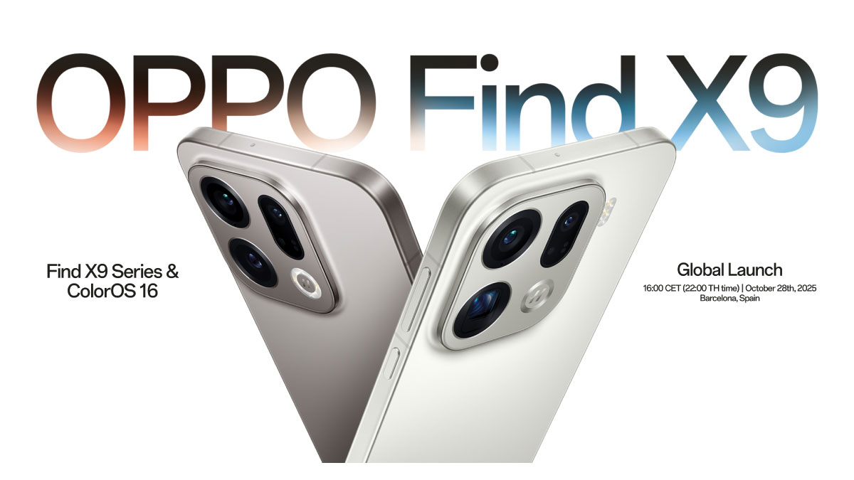 OPPO แบรนด์อุปกรณ์อัจฉริยะชั้นนำระดับโลก ประกาศเปิดตัวสมาร์ตโฟนแฟลกชิปรุ่นล่าสุด OPPO Find X9 Series สู่ตลาดโลกอย่างเป็นทางการ หลังจากเปิดตัวอย่างประสบความสำเร็จในประเทศจีน โดยงานเปิดตัวระดับโลกจะจัดขึ้นที่เมืองบาร์เซโลนา ประเทศสเปน ในวันที่ 28 ตุลาคม 2568 เวลา 22.00 น. (ตามเวลาประเทศไทย) ซึ่ง OPPO Find X9 และ OPPO Find X9 Pro จะเปิดตัวสู่สายตาชาวโลก พร้อมยกระดับมาตรฐานใหม่ให้กับการถ่ายภาพด้วยประสิทธิภาพความเป็นเลิศของสมาร์ตโฟนเรือธง