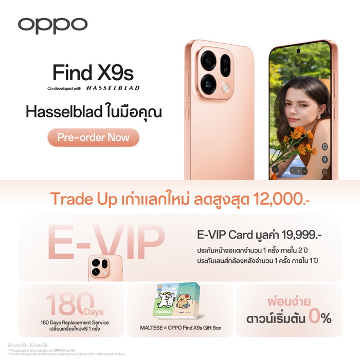 ออปโป้ประกาศเปิดตัว OPPO Find X9 Ultra และ OPPO Find X9s รุ่นใหม่ล่าสุดอย่างเป็นทางการ มาพร้อมนิยามกล้องมือถือไปสู่อุปกรณ์ระดับมืออาชีพ ที่มาพร้อมกับประสิทธิภาพระดับอัลตราใน OPPO Find X9 Ultra ที่มาพร้อมระบบกล้อง Hasselblad Master ถึง 5 ตัว นำโดยครั้งแรกและหนึ่งเดียวในอุตสาหกรรม กับกล้อง Hasselblad 50MP เทเลโฟโต้ ซูมออปติคอล 10 เท่า พร้อมเทคโนโลยี Ultra-Sensing ถ่ายทอดทุกรายละเอียดได้อย่างคมชัดแม้ในระยะไกล ทำงานร่วมกับกล้องหลัก Hasselblad 200MP พร้อมเทคโนโลยี Ultra-Sensing ซึ่งเป็นกล้องหลักที่คมชัดที่สุดในอุตสาหกรรม มอบภาพถ่ายระดับ DSLR ที่แม้จะครอปภาพก็ยังคงความละเอียดและมิติที่สวยงามระดับโปร