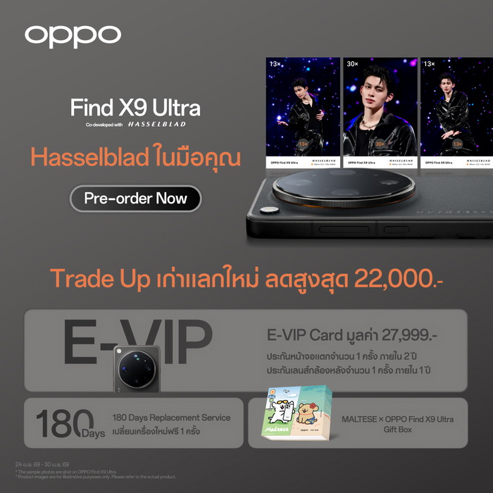 สำหรับผู้ที่สนใจเป็นเจ้าของ OPPO Find X9 Ultra และ OPPO Find X9s สามารถสั่งจองได้ตั้งแต่วันที่ 24 - 30 เมษายน 2569 พร้อมรับข้อเสนอสุดพิเศษในช่วง Pre-order และเป็นเจ้าของได้ง่ายมากยิ่งขึ้นด้วยโปรโมชั่น Trade-up นำเครื่องเก่ามาแลกเครื่องใหม่ ลดสูงสุด 22,000 บาท