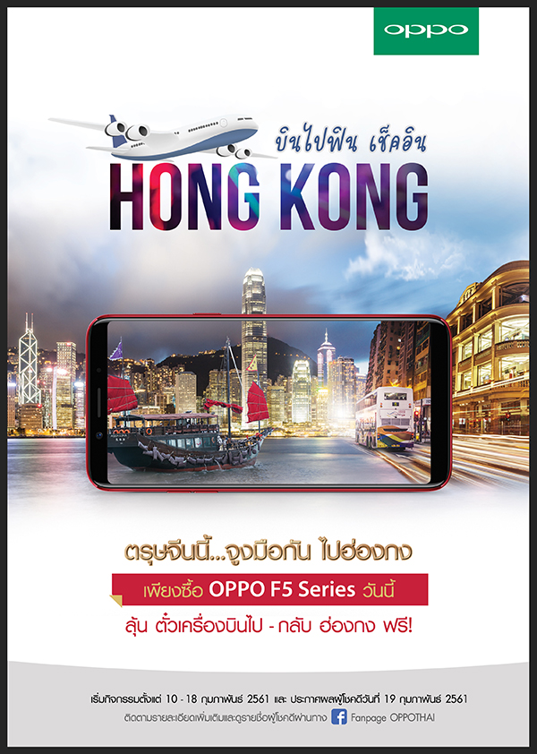ออปโป้(OPPO)แบรนด์สมาร์ทโฟนชั้นนำผู้เชี่ยวชาญด้านการถ่ายภาพเซลฟี่ขอมอบของขวัญสุดพิเศษต้อนรับเทศกาลตรุษจีน กับกิจกรรม “บินไปฟิน เช็คอิน HONG KONG” กติกาง่ายๆ เพียงคุณซื้อสมาร์ทโฟน OPPO F5 Series (F5 Youth, F5, และ F5 6GB) รุ่นใดก็ได้ ระหว่างวันที่ 10 –18 กุมภาพันธ์ 2561 ก็มีสิทธิ์ลุ้นรับตั๋วเครื่องบินไปฟินที่ฮ่องกง ทั้งหมด 3 รางวัล รางวัลละ 2 ที่นั่ง และจะประกาศรางวัลในวันที่ 19 กุมภาพันธ์นี้ สำหรับผู้ที่สนใจ สามารถเข้าไปสอบถามข้อมูลเพิ่มเติมได้ที่ OPPO Brand Shop และตัวแทนจำหน่ายทุกสาขา รวมถึงสามารถติดตามรายละเอียดเพิ่มเติมได้ที่ https://www.facebook.com/oppothai/