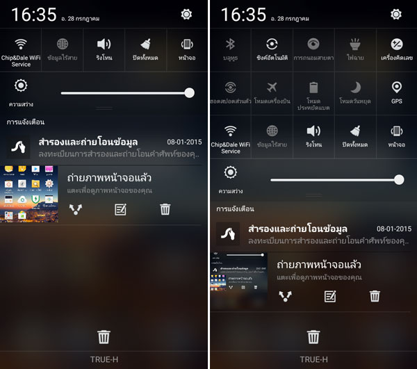 Notification Center หรือแถบการแจ้งเตือน สามารถเลือกตั้งค่า เมนูลัด ที่ใช้งานบ่อย ได้จากส่วนของ การตั้งค่า นอกจากนี้ ยังสามารถปรับความสว่างของหน้าจอ, เปิด-ปิดการเล่นเพลง และเข้าสู่ แอปพลิเคชัน การตั้งค่า (Settings) ได้จากส่วนนี้ด้วยเช่นเดียวกัน