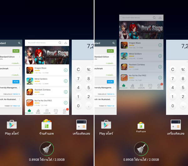 การแตะปุ่มเมนูค้างไว้ จะเข้าสู่โหมด Multitasking สามารถสลับไปใช้งานแอปพลิเคชันอื่น หรือปิดแอปพลิเคชันที่ไม่ใช้งาน เพื่อเพิ่ม RAM ให้กับตัวเครื่อง