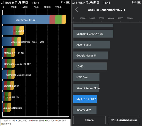ปิดท้ายด้วยผลการทดสอบ Benchmark บน OPPO Mirror 5 กันบ้าง โดยผลการทดสอบด้วยโปรแกรม Quadrant วัดความเร็วในการทำงานของ CPU และกราฟฟิค อยู่ที่ 14192 คะแนน และ AnTuTu ทดสอบ CPU, 2D & 3D graphics, SD card และ Database อยู่ที่ 25017 คะแนน