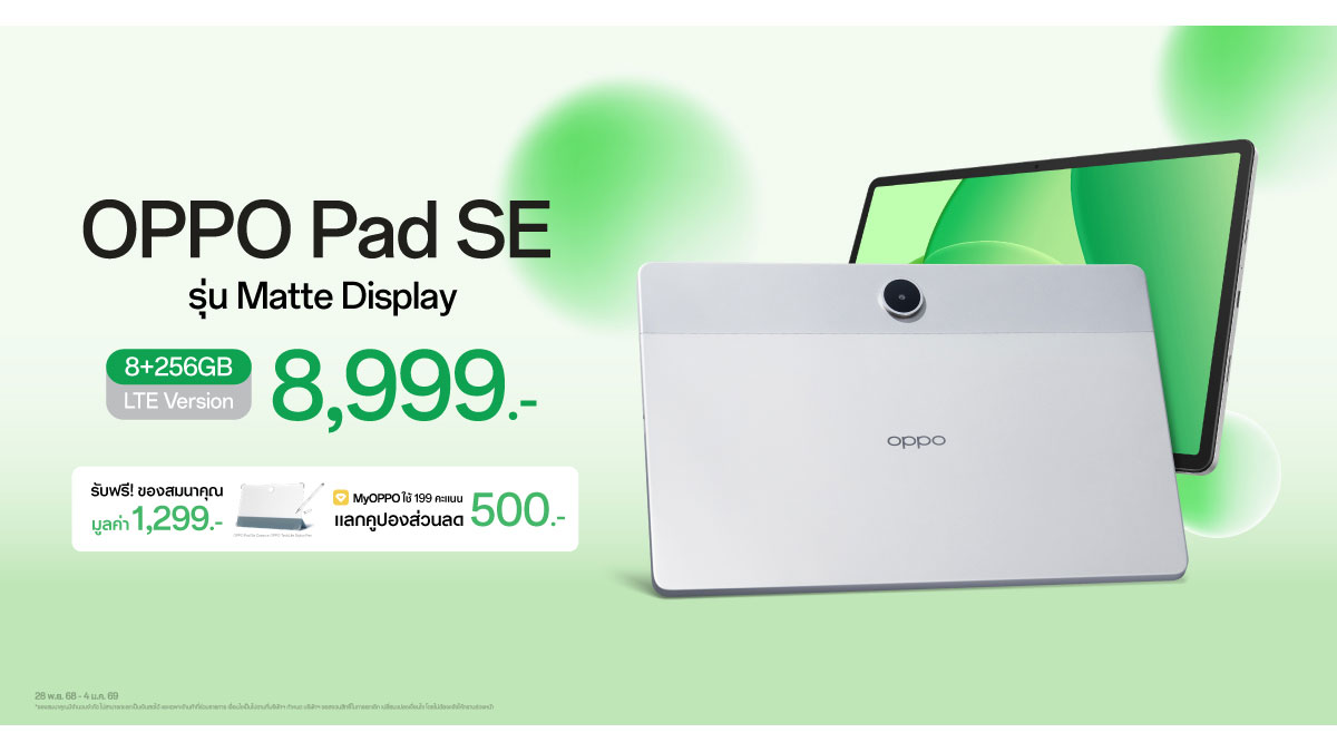 OPPO ประกาศวางจำหน่าย “OPPO Pad SE รุ่น Matte Display” แท็บเล็ตสุดคุ้มค่า ตอบโจทย์ทุกเรื่องของการใช้งานได้ทุกที่ทุกเวลาที่มาพร้อมกับการใส่ซิม ทำให้การใช้งานไม่สะดุด ลื่นไหล ตอบโจทย์ทุกสถานการณ์ ที่พร้อมมอบการใช้งานสุดสมาร์ท พร้อมมอบความบันเทิงไร้ขีดจำกัด สนุกตลอดวัน อย่างเป็นทางการในประเทศไทย OPPO Pad SE มาพร้อมความจุใหม่ 8+256GB ในราคาเพียง 8,999 บาทเท่านั้น! อีกทั้งยังรับฟรี OPPO TechLife Stylus Pen และ OPPO Pad SE Case Blue รวมมูลค่า 1,299 บาท พร้อม MyOPPO คูปอง ส่วนลด 500 บาท!