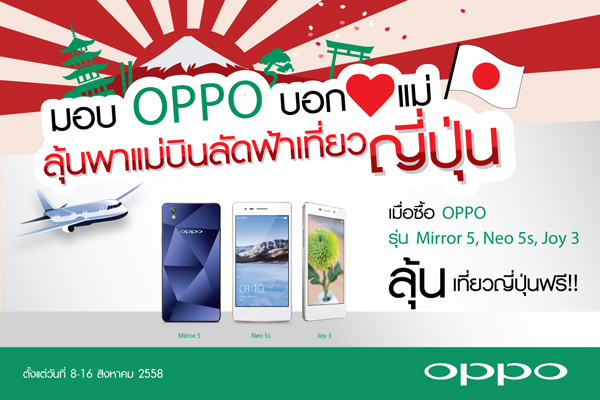 ทำวันแม่ปีนี้ให้เป็นช่วงเวลาที่อบอุ่นและน่าประทับใจ ด้วยการมอบสมาร์ทโฟนที่ดีที่สุด ให้กับผู้หญิงที่คุณรักมากที่สุดในชีวิตOPPO ขอมอบโปรโมชั่นสุดพิเศษสำหรับคุณลูกๆ ที่ซื้อสมาร์ทโฟนราคาคุ้มค่าทั้ง 3 รุ่นได้แก่ OPPO Mirror 5 , OPPO Neo 5s และ OPPO Joy 3 ในช่วงวันที่ 8 - 16 สิงหาคม 2558 สามารถร่วมลุ้นโชคควงคู่กับคุณแม่ไปเที่ยวญี่ปุ่น 5 วัน 4 คืน จำนวน 3 รางวัล 1 รางวัลต่อ1 ใบเสร็จ (เดินทางประมาณเดือนตุลาคม วันเวลาเดินทางอาจเปลี่ยนแปลงตามความเหมาะสม) ร่วมสนุกด้วยการส่งภาพถ่ายหน้าบัตรรับประกันเครื่องและใบเสร็จรับเงิน (ภาพถ่ายต้องชัดเจน) พร้อมแจ้งชื่อ-นามสกุล, ที่อยู่, เบอร์โทร, รุ่นที่ซื้อ และ หมายเลขรหัสเครื่อง (เลขอีมี่) มาที่อีเมล [email protected]รักแม่ เลือกซื้อ OPPO ให้แม่นะครับ