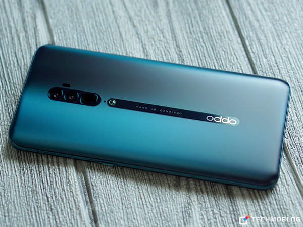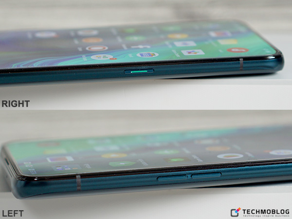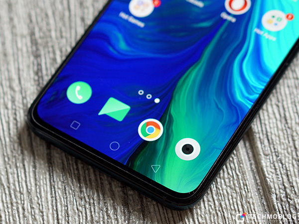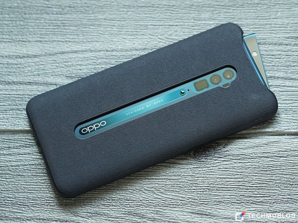 OPPO Reno 10x Zoom รุ่นที่นำมารีวิวในวันนี้ เป็นตัวเครื่องสี Ocean Green ที่มีการไล่เฉดสีหลายมิติแบบ Iridescent Multi-Layer Finish ซึ่งกล้องด้านหลัง 3 ตัวนั้น จะถูกซ่อนไว้ใต้กระจก พร้อมกับเคลือบผิวด้วยเทคโนโลยีนาโนอีกหลายชั้น ทำให้ตัวเลนส์ไม่ยื่นนูนออกมา และเพื่อป้องกันไม่ให้เลนส์กล้องเกิดรอยขีดข่วนเมื่อวางไว้บนโต๊ะหรือพื้นผิวต่าง ๆ จึงมีปุ่ม O-Dot ซึ่งเป็นปุ่มเซรามิกที่มีความแข็งแกร่ง ทำให้ตัวเครื่องยกขึ้นสูงเล็กน้อย