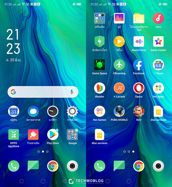 OPPO Reno 10x Zoom ไม่มี App Drawer ทำให้แอปพลิเคชันที่ติดตั้งมาให้แล้วในตัวเครื่อง รวมถึงแอปพลิเคชันที่ดาวน์โหลดมาอยู่ในหน้า Homescreen ทั้งหมด ซึ่งผู้ใช้สามารถเลือกจัดให้เป็นหมวดหมู่ได้ เบื้องต้นนั้น ได้มีการติดตั้งแอปพลิเคชันจาก Google มาให้อย่างครบครัน ทั้ง Chrome, Gmail, Google Maps, YouTube รวมถึงเครื่องมือต่าง ๆ ที่เป็นประโยชน์ต่อการใช้งาน