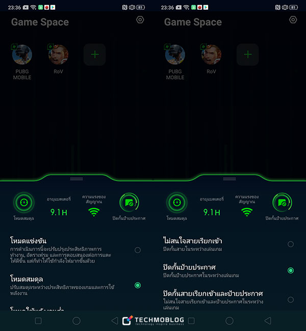 สำหรับ Game Space เป็นฟีเจอร์ที่ถูกพัฒนาขึ้นมาเพื่อคอเกมโดยเฉพาะเลยก็ว่าได้ กับการบล็อกการแจ้งเตือนต่าง ๆ ทั้งข้อความ รวมถึงสายเรียกเข้า ไม่ให้มารบกวนสมาธิและความสนุกในระหว่างที่กำลังเล่นเกม นอกจากนี้ ยังสามารถล็อกความสว่างของหน้าจอในระหว่างเล่นเกมได้ด้วยเช่นกัน