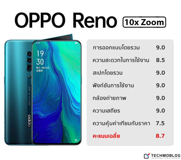 จากการทดสอบใช้งานในข้างต้น ก็พอจะสรุปได้ว่า OPPO Reno 10x Zoom เป็นสมาร์ทโฟนระดับไฮเอนด์ที่มีความน่าสนใจไม่น้อย เริ่มกันตั้งแต่รูปลักษณ์ภายนอกที่ถูกออกแบบให้เป็นดีไซน์แบบไร้ขอบ จอไม่บาก จอไม่เจาะรู ด้วยหน้าจอแสดงผลขนาดใหญ่ถึง 6.6 นิ้ว แบบ AMOLED Panoramic Screen ความละเอียด 1080 x 2340 พิกเซล (FHD+) ในอัตราส่วน 19:5:9 และด้วยดีไซน์แบบไร้ขอบนี้ ทำให้มีสัดส่วนหน้าจอแสดงผลกับตัวเครื่องมากถึง 93.1% แถมครอบทับด้วยกระจกหน้าจอแบบ Corning Gorilla Glass 6 เพิ่มความแกร่งอีกชั้น นอกจากนี้ ยังมีการติดตั้งเซ็นเซอร์สแกนลายนิ้วมือบนหน้าจอแบบ Hidden Fingerprint Unlock 2.0 ที่ช่วยทำให้การปลดล็อกหน้าจอรวดเร็วกว่าเวอร์ชันเดิมถึง 28.5% ส่วนด้านหลังตัวเครื่อง มาพร้อมกับเทคโนโลยีการผลิตแบบไล่เฉดสีหลายมิติแบบ Iridescent Multi-Layer Finish