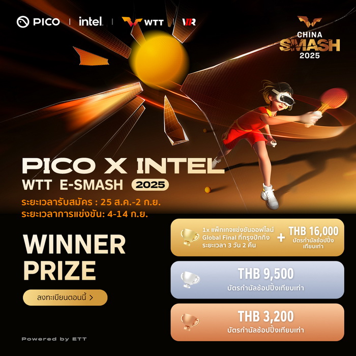 แบรนด์อีเวนต์กีฬา WTT Grand Smash ก้าวสู่มิติใหม่แห่งมหกรรม World Table Tennis! เมื่อ PICO แบรนด์ผู้นำด้านเทคโนโลยีโลกจริงเสมือน (VR) และ Intel จับมือเปิดตัวมหกรรม “PICO x Intel WTT E-Smash 2025” การแข่งขันในโลกเสมือนจริงรูปแบบใหม่ที่จะจัดขึ้นควบคู่กับงาน China Smash 2025 บริเวณ Shougang Park กรุงปักกิ่ง ณ ที่ซึ่ง “โลกจริง” และ “โลกดิจิทัล” จะมาบรรจบกัน เพื่อสร้างมาตรฐานใหม่ของการแข่งขัน การเชียร์ และการสัมผัสประสบการณ์กีฬาในโลกยุคอนาคตที่แท้จริง!