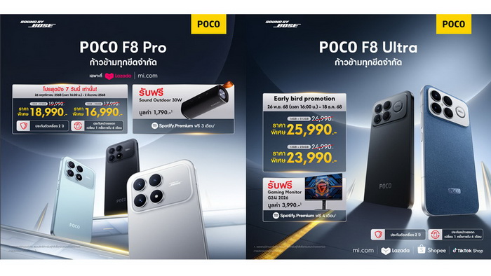 มร. คัง โหลว ผู้จัดการอาวุโสฝ่ายการตลาดผลิตภัณฑ์และโฆษกของ POCO Global กล่าวว่า “ตลอดเจ็ดปีแห่งความพยายามอย่างทุ่มเท POCO ได้เติบโตจนกลายเป็นผู้เล่นหลักในตลาดสมาร์ทโฟน และท้าทายกับขนบเดิมๆ ด้วยนวัตกรรมใหม่ๆ อย่างต่อเนื่อง สมาร์ทโฟน POCO F8 Series ถูกออกแบบมาเพื่อตอบสนองความต้องการของผู้ใช้ที่หลากหลายมากยิ่งขึ้น โดย POCO F8 Ultra ได้สร้างมาตรฐานใหม่ให้กับสมาร์ทโฟนเรือธงอย่างแท้จริง ในขณะที่ POCO F8 Pro ยังคงยึดมั่นในปรัชญาของเราในการสร้างประสบการณ์การใช้งานสมาร์ทโฟนเรือธงที่ทรงพลังและรอบด้านให้ผู้ใช้สามารถเข้าถึงได้มากขึ้น POCO กำลังก้าวเข้าสู่ตลาดพรีเมียมและแบรนด์จะยังคงมุ่งมั่นที่จะมอบผลิตภัณฑ์คุณภาพสูงและคุ้มค่าที่ทุกคนเข้าถึงได้”