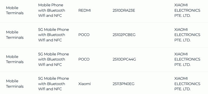 จากข้อมูลล่าสุด มีสมาร์ตโฟนใหม่จากทั้ง POCO, Xiaomi และ Redmi ผ่านการอนุมัติจากหน่วยงาน IMDA แล้ว โดยได้แก่