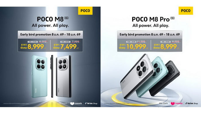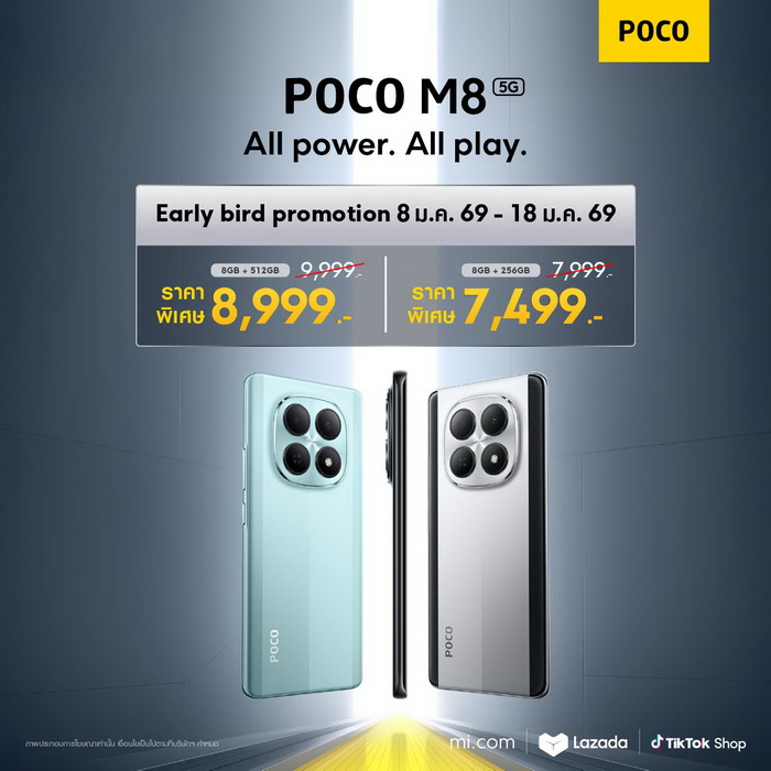 POCO แบรนด์เทคโนโลยียอดนิยมในกลุ่มคนรุ่นใหม่ที่รักเทคโนโลยี เปิดตัวสมาร์ทโฟนรุ่นใหม่ล่าสุด POCO M8 5G และ POCO M8 Pro 5G อย่างเป็นทางการ นับเป็นก้าวสำคัญของการยกระดับ POCO M Series สู่ตลาดสมาร์ทโฟนระดับกลาง พร้อมนำประสบการณ์ความบันเทิงบนเครือข่าย 5G ระดับเรือธงมาให้ผู้ใช้ทุกคนได้สัมผัส1 POCO M8 Series วางจำหน่ายแล้ววันนี้ในเริ่มต้นเพียง 7,999 บาท26