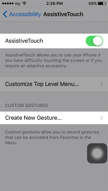 หากยังไม่ได้เปิดใช้งาน AssistiveTouch ก็เปิดใช้เสียก่อน แล้วจึงกดเข้าไปที่ Create New Gesture... ด้านล่าง