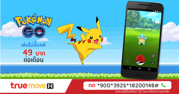 Truemove H ผู้ให้บริการเครือข่ายมือถือรายใหญ่ของไทย ได้ออกแพ็คเกจมาจับกระแส Pokemon Goแล้วครับ โดยในวันนี้ได้ออกแพ็กเกจเสริมใหม่สำหรับเหล่าเทรนเนอร์ Pokemon GO โดยเฉพาะ ด้วยโปรโมชันเสริมเล่น Pokemon Go ผ่านอินเทอร์เน็ต 3G/4G ได้แบบไม่อั้นในราคาโปรโมชันช่วงแนะนำเดือนละ 49 บาท (จากราคาปกติ 149 บาท) โดยโปรเสริมนี้ไม่ใช่แค่สำหรับลูกค้าเติมเงินเท่านั้น ลูกค้าระบบรายเดือนก็สามารถที่จะซื้อแพคเกจเสริมนี้ได้เช่นกัน สำหรับลูกค้า truemoveH ที่ต้องการสมัครสามารถกดหมายเลขและโทรออกได้ดังนี้ *900*3925*18200148#